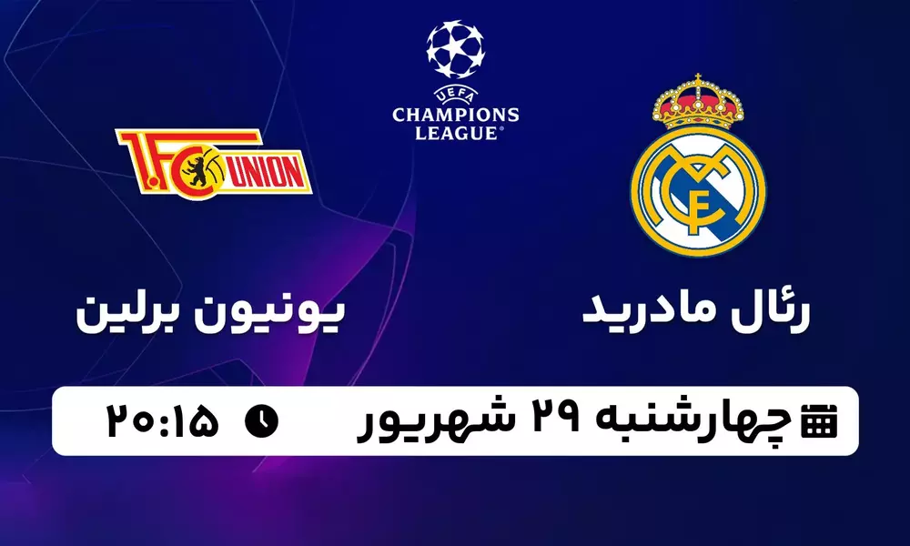 ساعت بازی دو تیم رئال مادرید و یونیون برلین نیز ساعت 20:15 به وقت ایران است. پخش زنده این بازی جذاب را می‌‌توانید روز چهارشنبه، از طریق سایت پرمخاطب fam.ir از پخش زنده شبکه ورزش دنبال کنید.