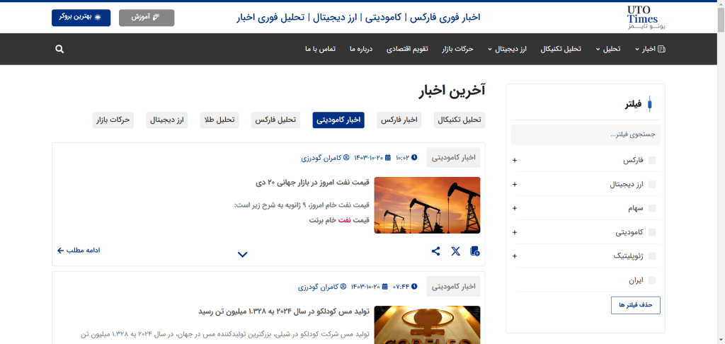 بخش اخبار نفت و کامودیتیها یوتوتایمز، به بررسی تحولات بازار نفت خام، گاز طبیعی و سایر کالاهای اساسی میپردازد. این بخش شامل تحلیلهای مربوط به عرضه و تقاضای نفت، تحولات ژئوپلیتیکی مؤثر بر قیمت نفت و پیشبینیهای کوتاهمدت و بلندمدت این بازار است.